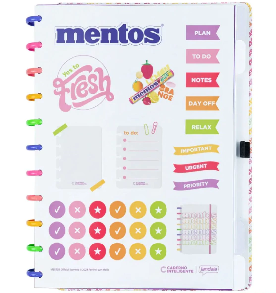 Uma colaboração única entre Caderno Inteligente, Jandaia e Mentos, combina o design icônico e refrescante da Mentos com a praticidade e inovação do Caderno Inteligente, criando uma experiência de escrita funcional e divertida.