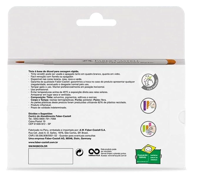 Os marcadores de quadro branco da Faber-Castell são de excelente qualidade e garantem um uso tranquilo tanto em quadro branco quanto em lousa de vidro, pois são de fácil remoção utilizando uma flanela ou apagador. Além disso, foram desenvolvidos para terem um traço ideal para leituras a longa distância e tintas sem falhas e vibrantes. Sempre focados na sustentabilidade este produto foi feito utilizando 82% de plástico reciclado e a embalagem 100% de papel reciclável.